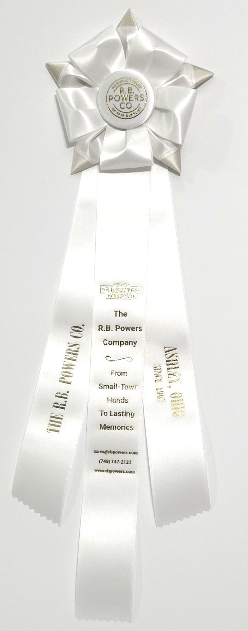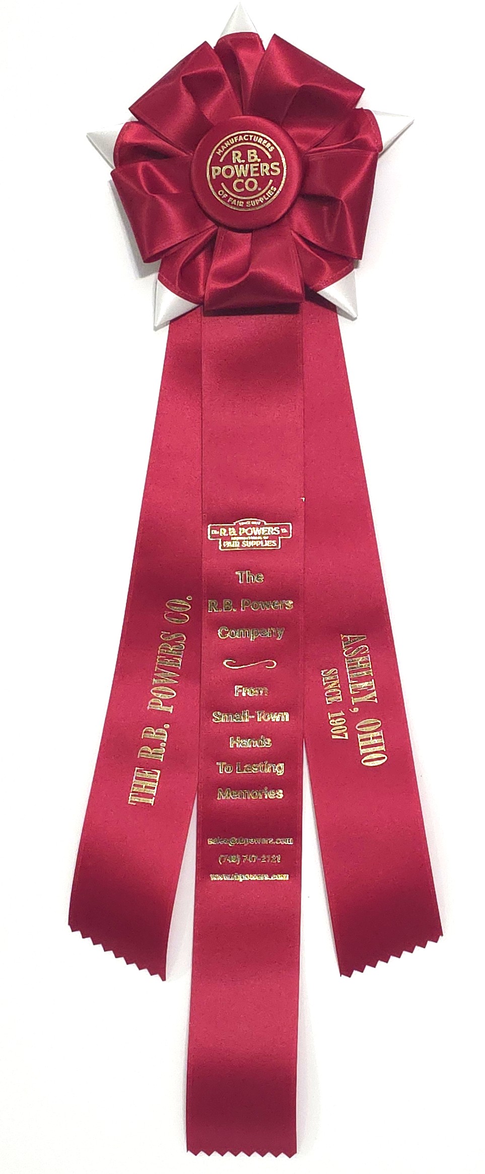 Custom rosette with 7″ rosette head and three 2″ x 18″ streamers. The rosette head has an inner row of looped ribbons and an outer row of petals, all surrounding the center button. Total length is 22 inches. Your logo (or stock logo of your choice) is printed in the center button.