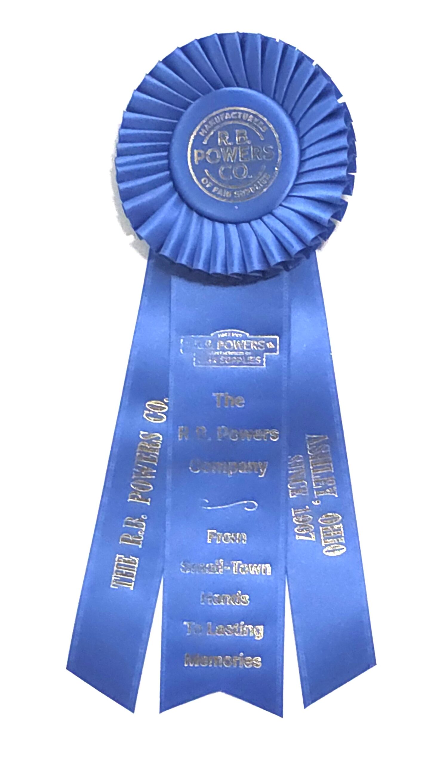 Custom rosette with 4″ rosette head and three 2″ x 8″ streamers. The rosette head has a single row of quill surrounding the center button. Total length is 11 inches. Your logo (or stock logo of your choice) is printed in the center button.