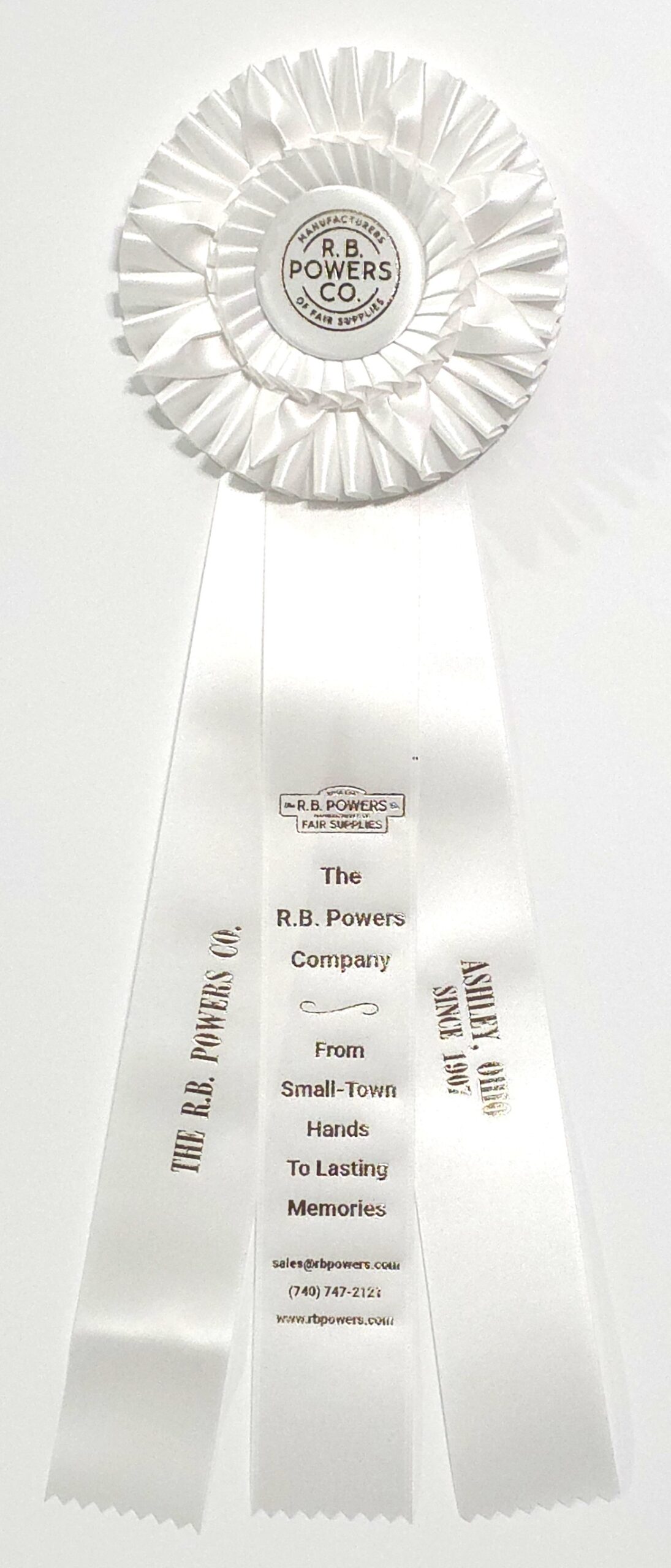 Custom rosette with 5.5″ rosette head and three 2″ x 12″ streamers. The rosette head has an inner row of quills and an outer row of quill overlapped by eight petals, all surrounding the center button. Total length is 18 inches. Your logo (or stock logo of your choice) is printed in the center button.