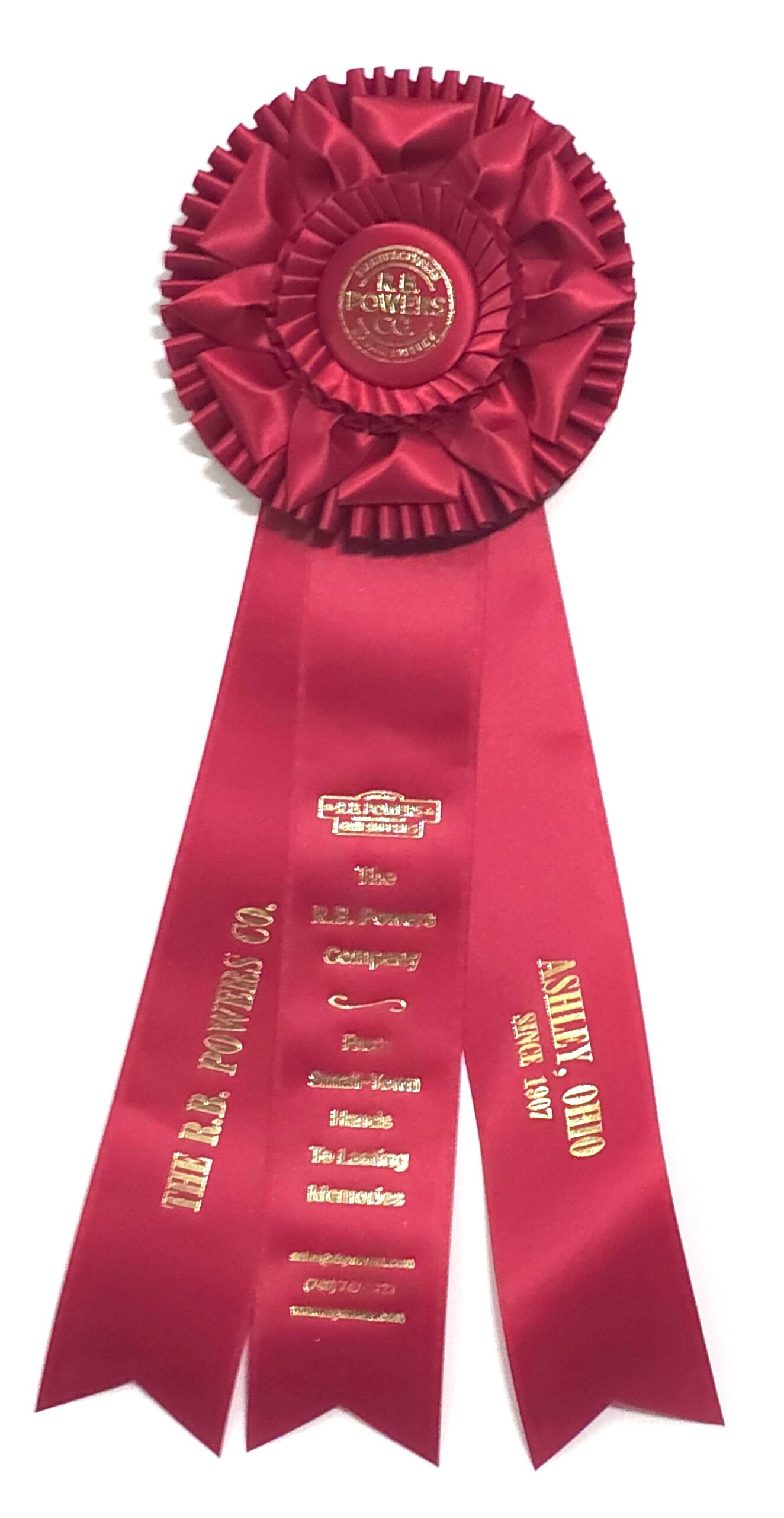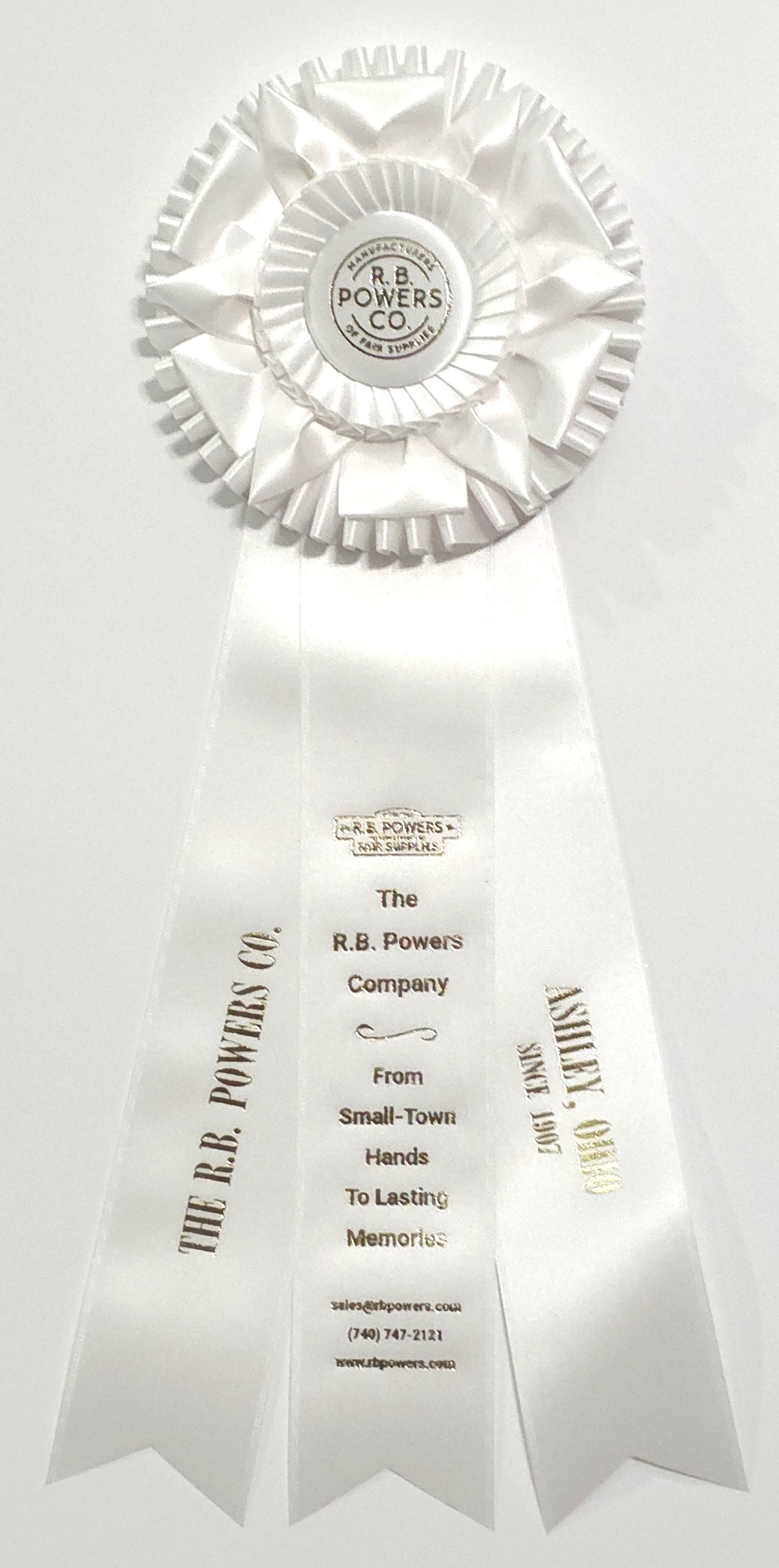 Custom rosette with 6.25″ rosette head and three 2.5″ x 15″ streamers. The rosette head has an outer row of quill, overlapped by looped ribbons and petals, and an inner row of quill surrounding the center button. Total length is 19 inches. Your logo (or stock logo of your choice) is printed in the center button.