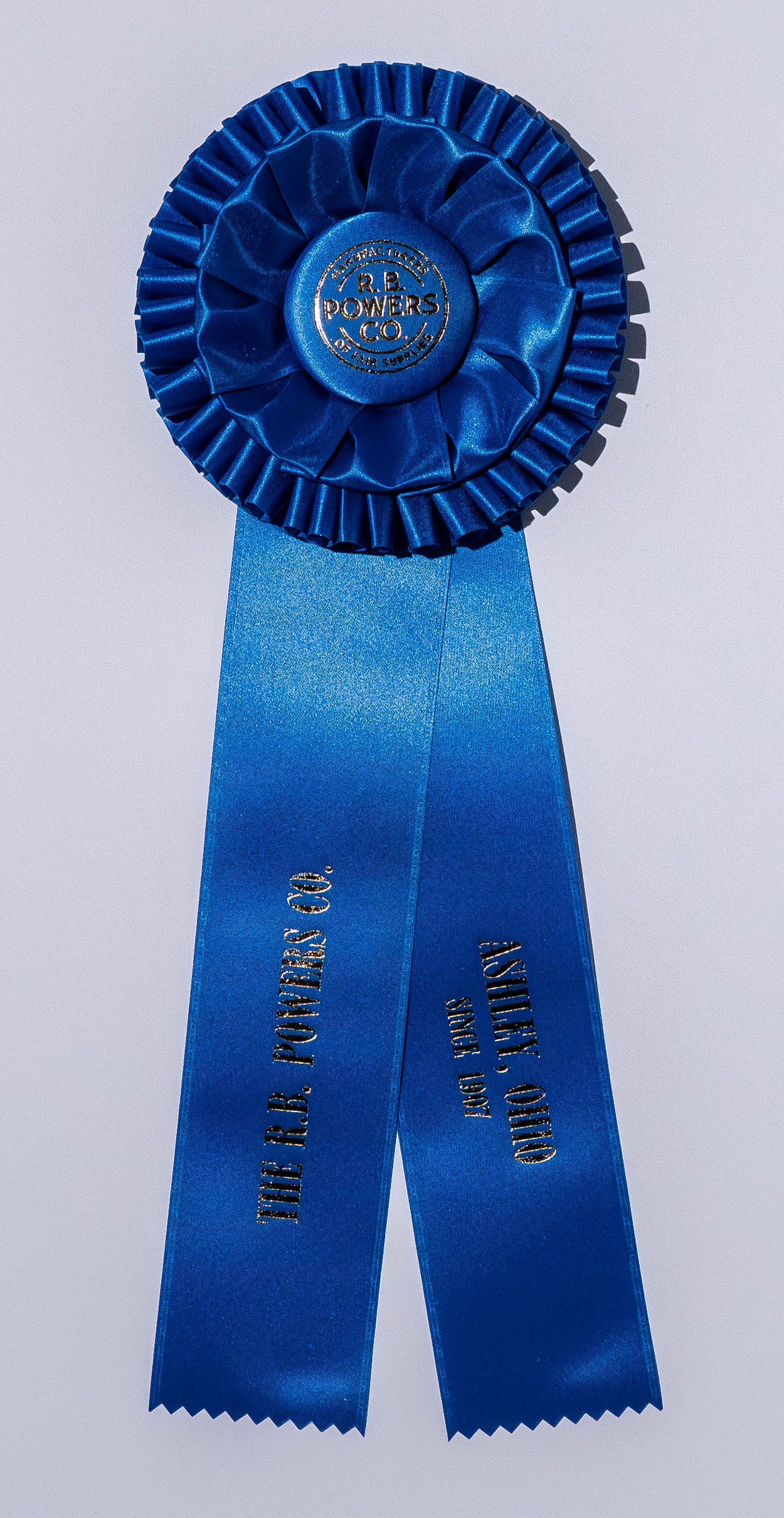 Custom rosette with 5.75″ rosette head and two 2.5″ x 12″ streamers. The rosette head has an inner row of looped ribbons and an outer row of quill, all surrounding the center button. Total length is 16 inches. Your logo (or stock logo of your choice) is printed in the center button.