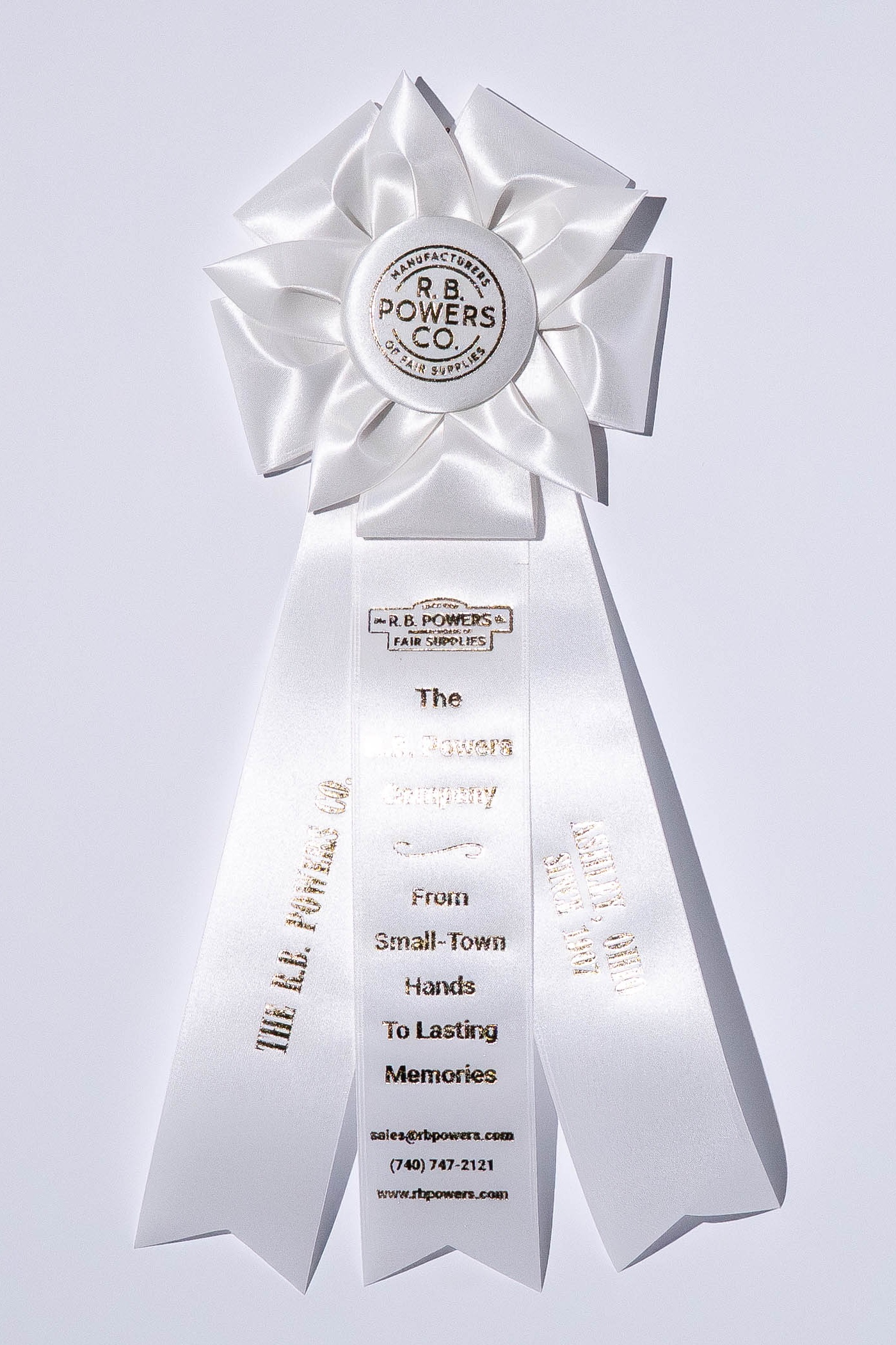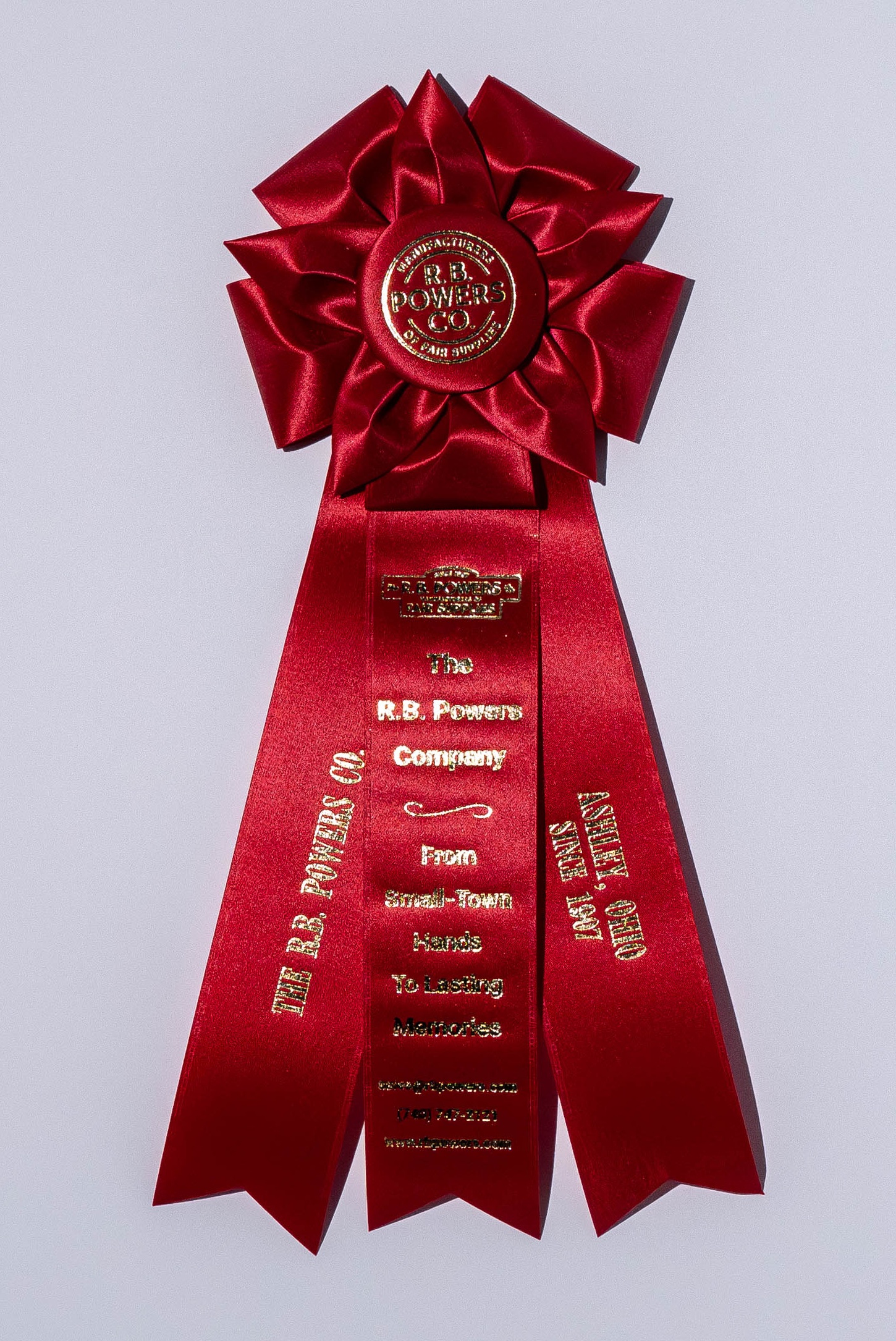 Custom rosette with 5.5″ rosette head and three 2″ x 10″ streamers. The rosette head has a row of alternating looped ribbons petals surrounding the center button. Total length is 14.5 inches. Your logo (or stock logo of your choice) is printed in the center button.