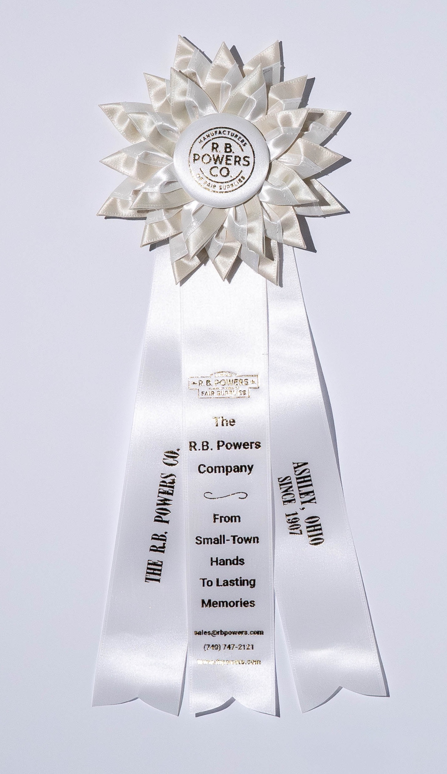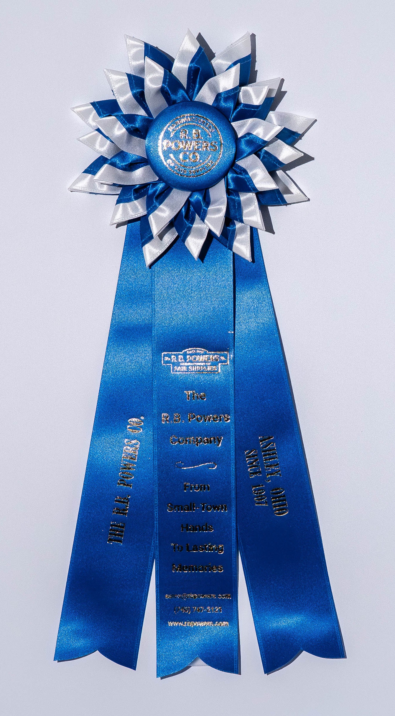 Custom rosette with 6″ rosette head and three 2″ x 12″ streamers. The rosette head has three rows of striped petals surrounding the center button. Total length is 16.5 inches. Your logo (or stock logo of your choice) is printed in the center button.