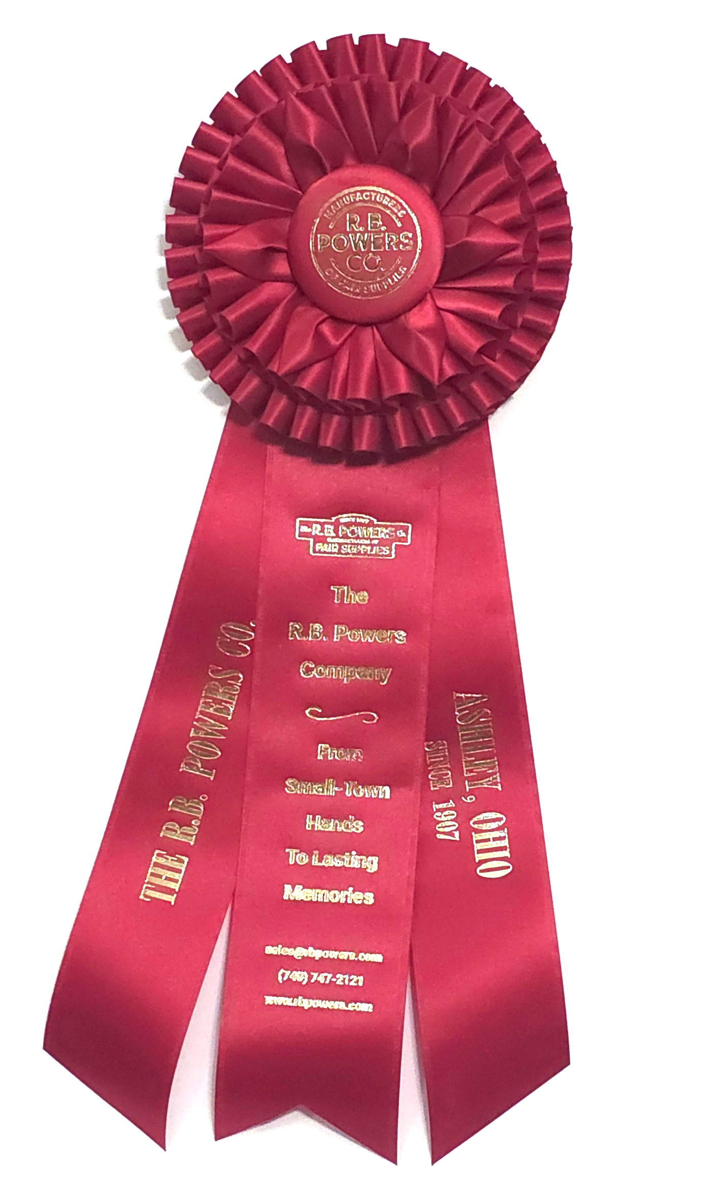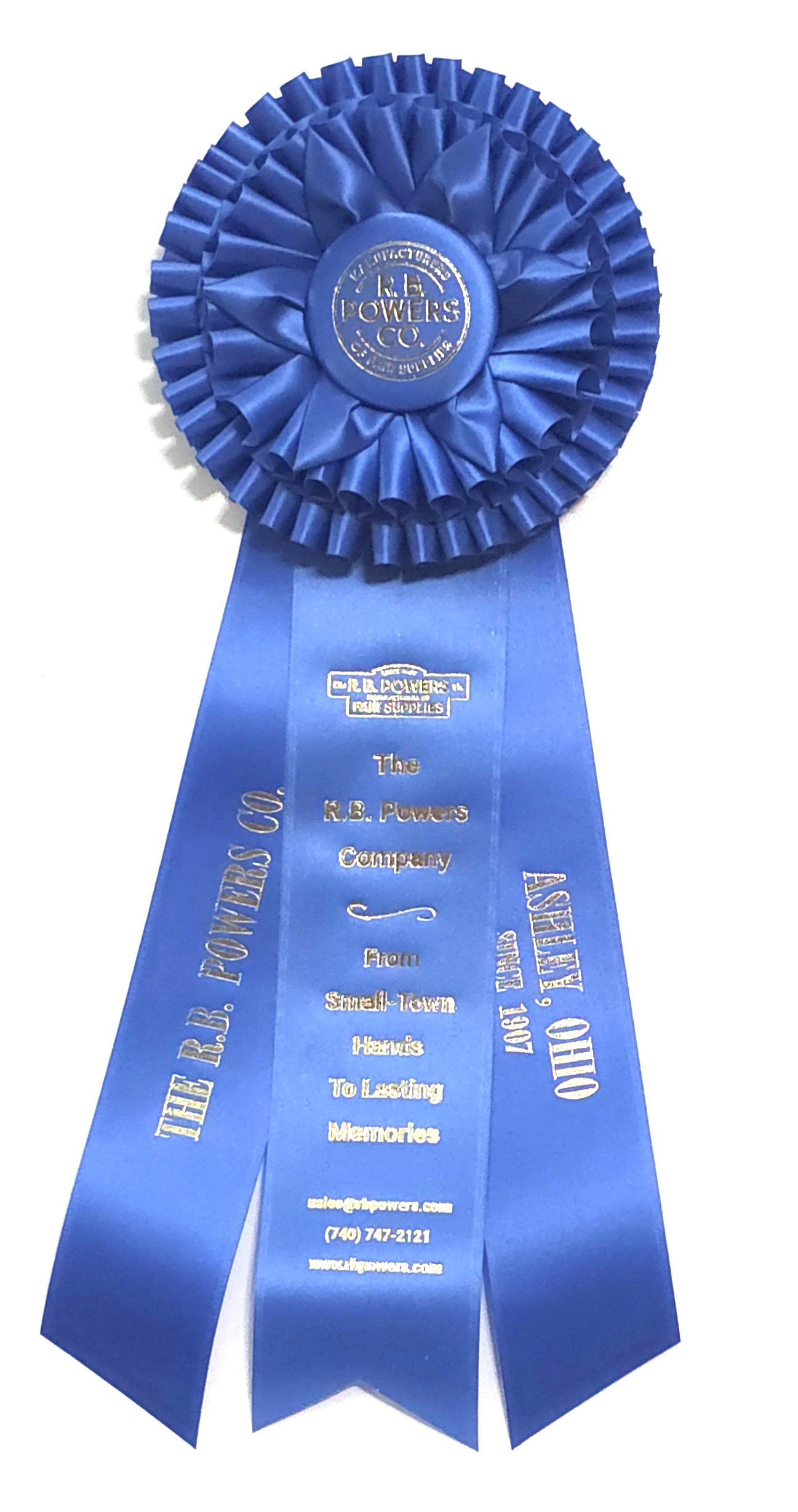 Custom rosette with 5.5″ rosette head and three 2.5″ x 12″ streamers. The rosette head has two rows of quill and six petals surrounding the center button. Total length is 15.5 inches. Your logo (or stock logo of your choice) is printed in the center button.