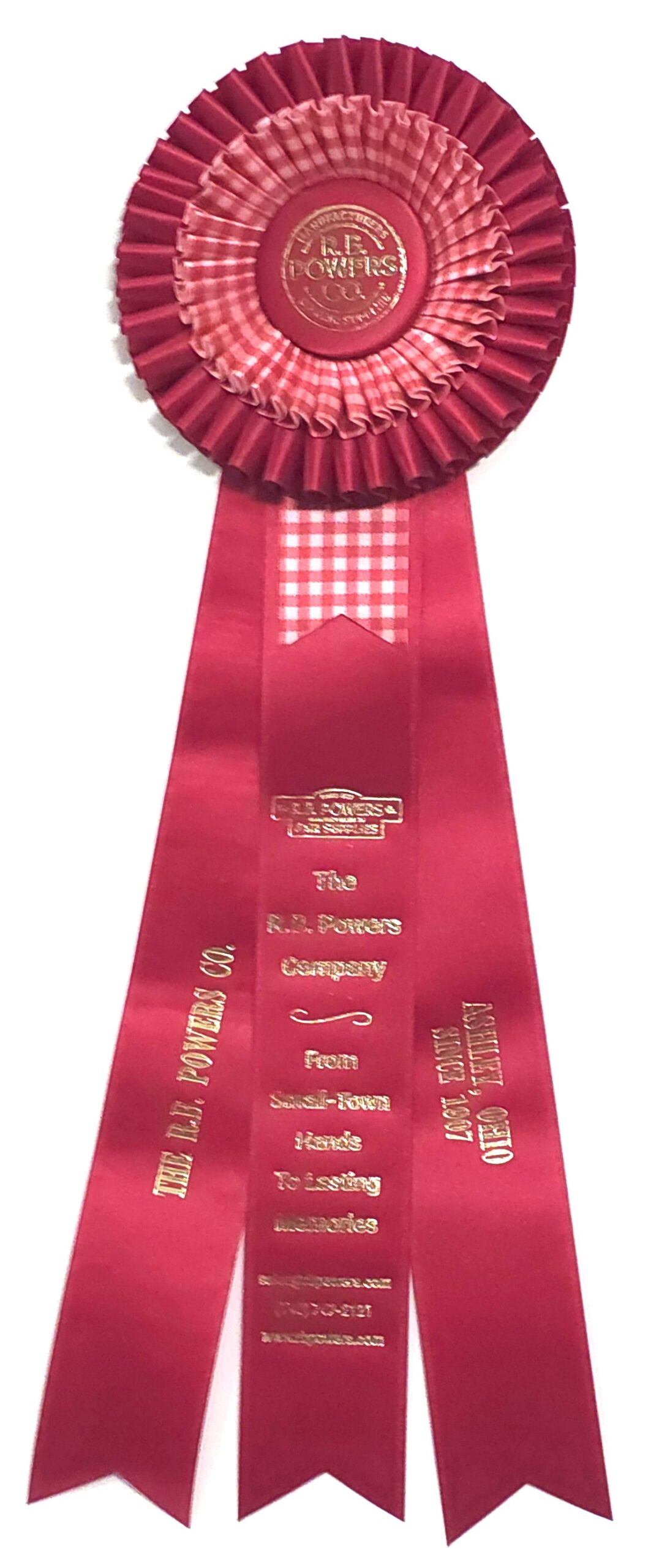Custom rosette with 5.75″ rosette head and three 2″ x 15″ streamers. The rosette head has two rows of quill surrounding the center button. Total length is 18 inches. Your logo (or stock logo of your choice) is printed in the center button.