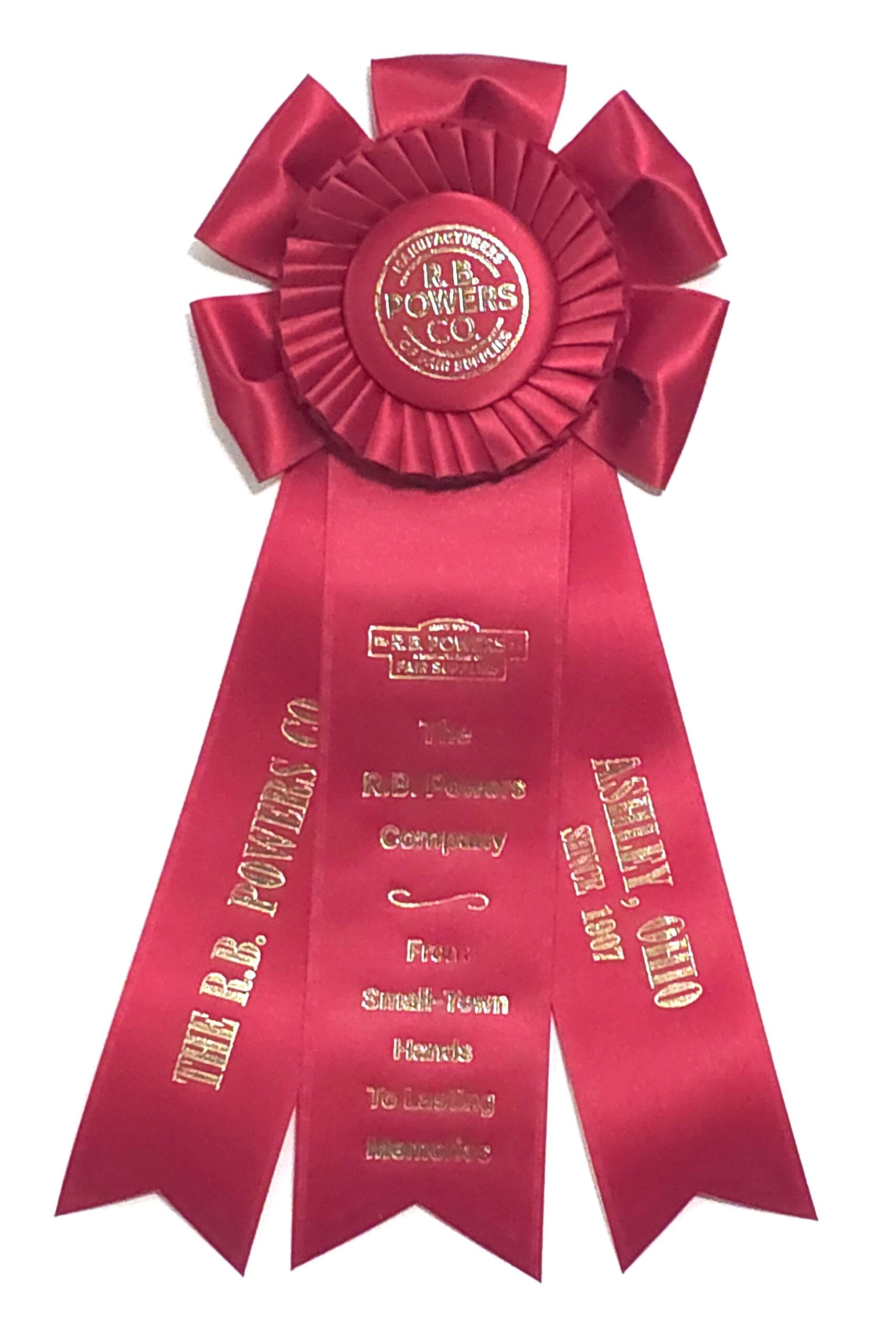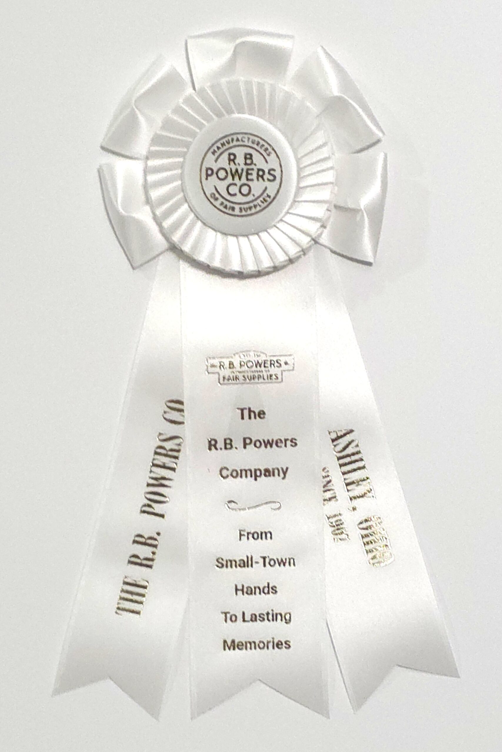 Custom rosette with 5.5″ rosette head and three 2.5″ x 9″ streamers. The rosette head has an inner row of quill and an outer row of looped ribbons, all surrounding the center button. Total length is 12.5 inches. Your logo (or stock logo of your choice) is printed in the center button.