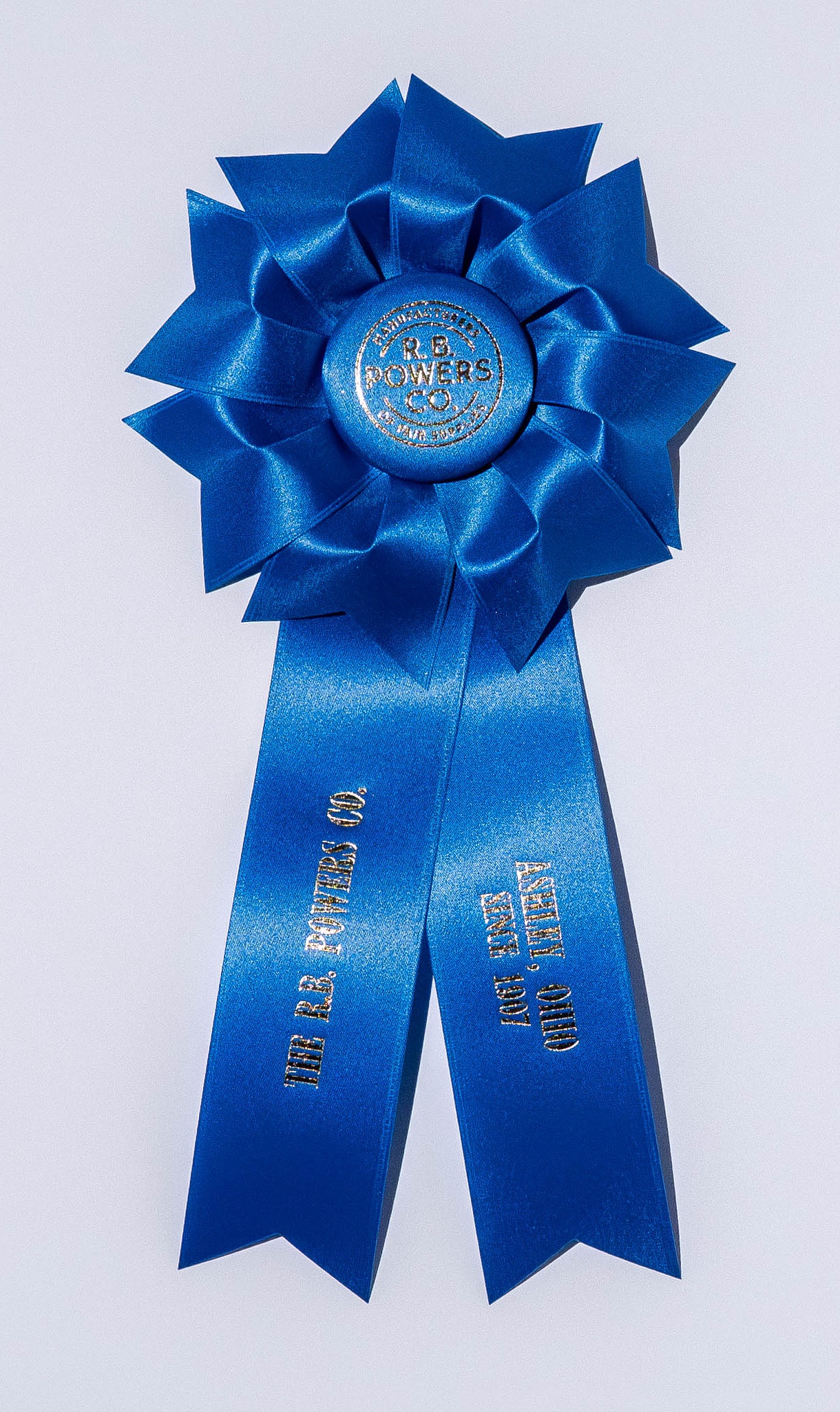 Custom rosette with 5.5″ rosette head and two 2″ x 9″ streamers. The rosette head has a row of petals, overlapped by looped ribbons, all surrounding the center button. Total length is 13 inches. Your logo (or stock logo of your choice) is printed in the center button.