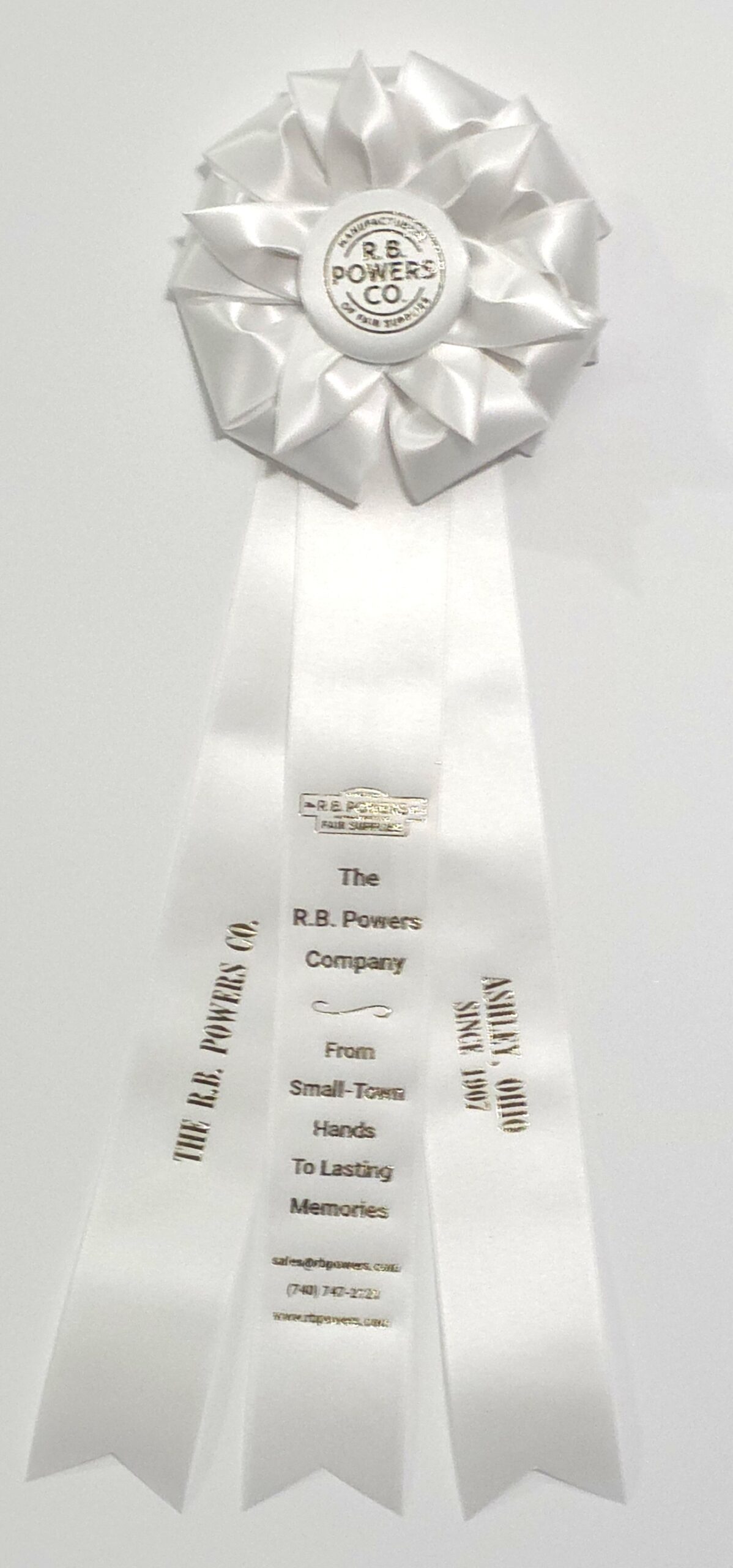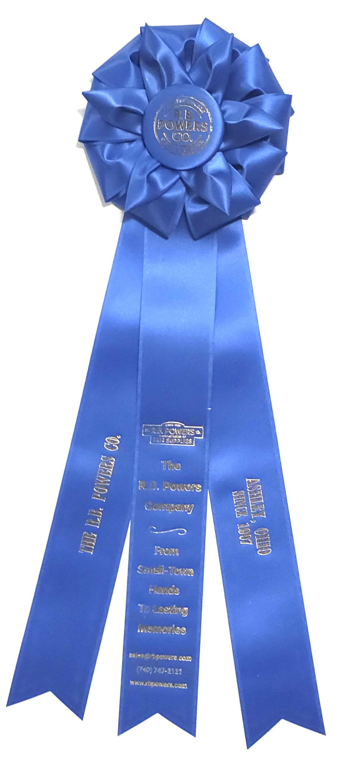 Custom rosette with 6″ rosette head and three 2″ x 15″ streamers. The rosette head has a row of looped ribbon and six petals surrounding the center button. Total length is 18.5 inches. Your logo (or stock logo of your choice) is printed in the center button.